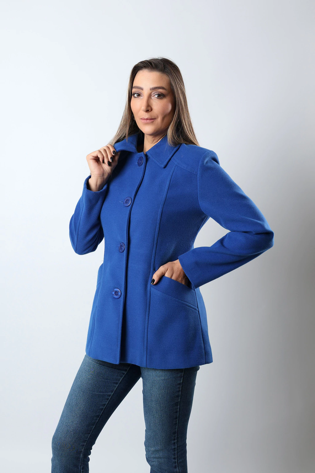 Descubra o Casaco Itália na deslumbrante cor azul royal, uma peça que irradia estilo e conforto. Seu corte acinturado valoriza a silhueta feminina, enquanto o caimento perfeito proporciona um visual refinado para diversas ocasiões.